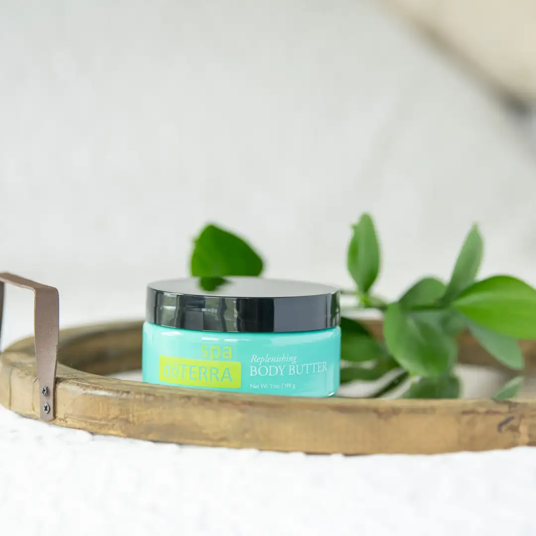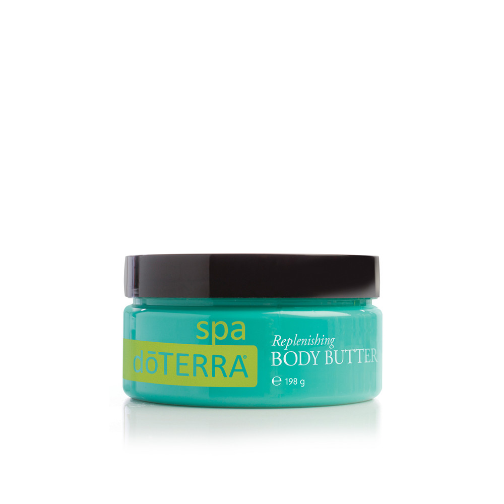 Verwöhnen Sie Ihre Haut mit der reichhaltigen, luxuriösen doTERRA SPA Replenishing Body Butter (hautglättende Körperbutter). Die Basis dieser natürlichen Rezeptur besteht aus Shea- und Kakaobutter, die beide tiefe Feuchtigkeit spenden und die Haut sanft und weich werden lassen. Jojobaöl wird rasch von der Haut aufgenommen und spendet Feuchtigkeit. Die essentiellen Fettsäuren aus Avocadoöl nähren die Haut und lassen sie sanft und weich zurück. Die ätherischen Öle aus Wildorange, Douglastanne und Weihrauch verwandeln diese Verwöhnrezeptur in ein intensiv-aromatisches Spa-Erlebnis, das gleichzeitig reinigt und aufbaut.