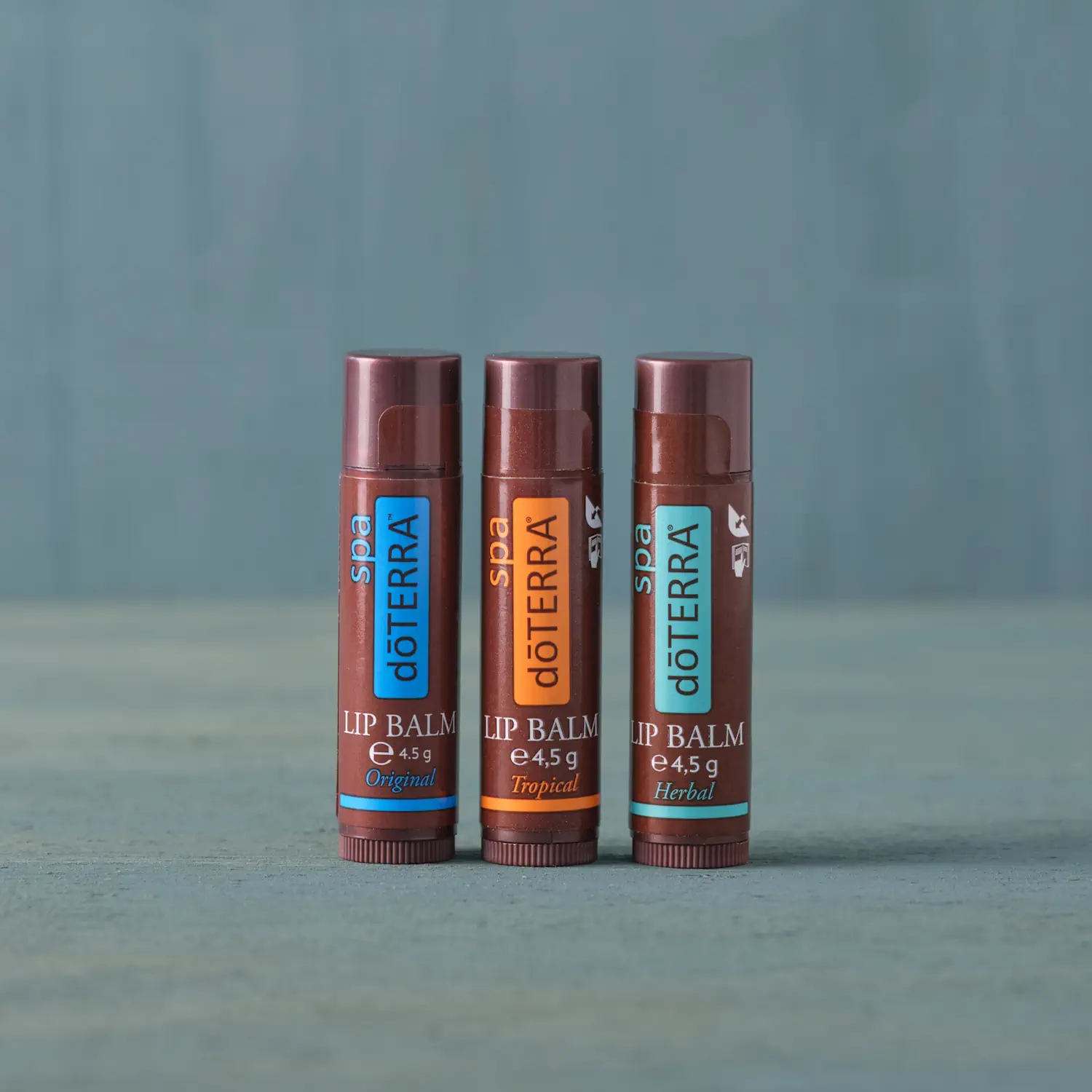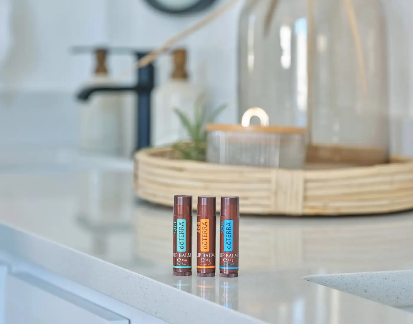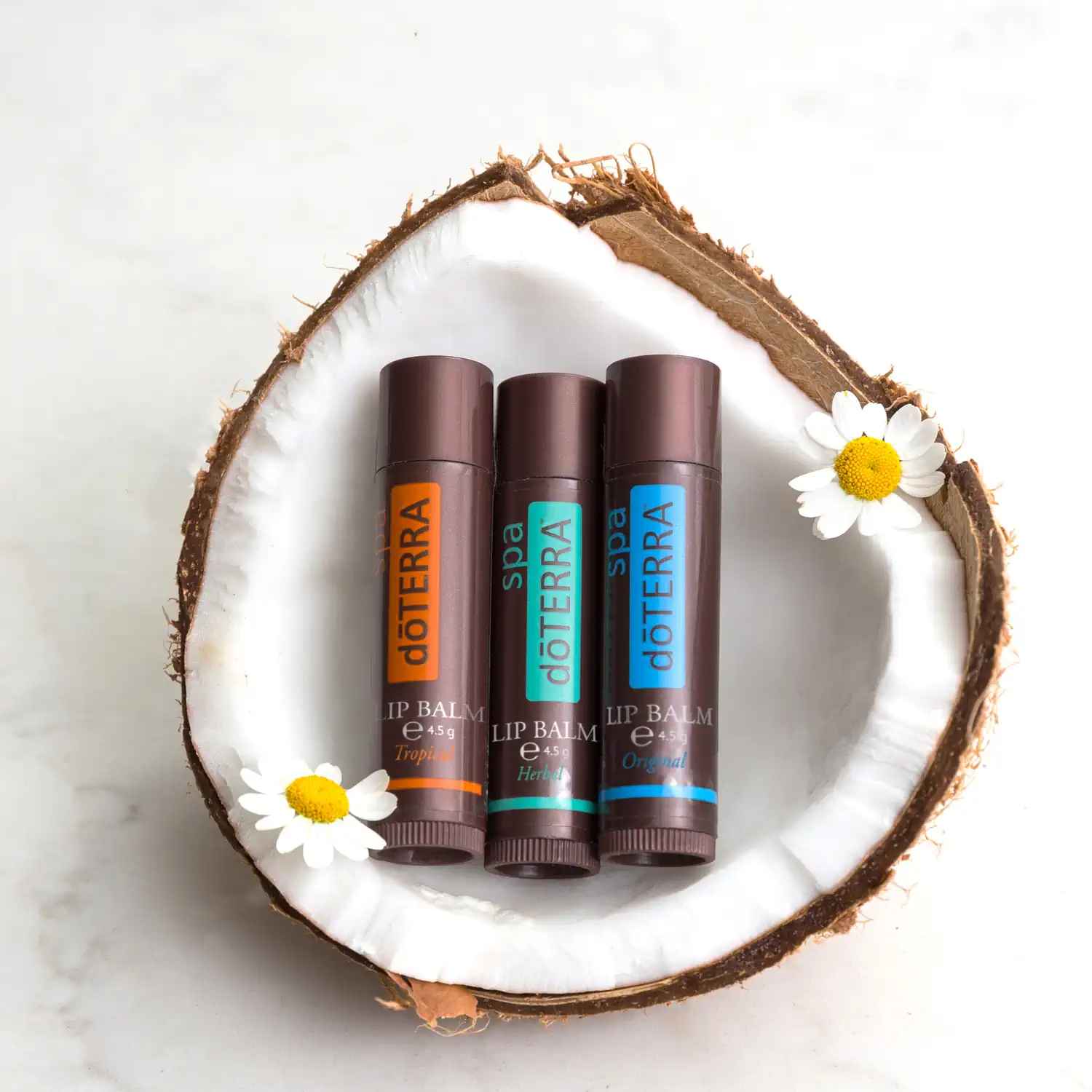Der doTERRA SPA Lippenbalsam besteht aus einer natürlichen Formel aus Pflanzenölen, Pflanzenauszügen und ätherischen Ölen, die Ihre Lippen beruhigen und mit Feuchtigkeit versorgen. Gleichzeitig erleben Sie einen einzigartigen Duft ätherischer Öle. Dieser extra feuchtigkeitsspendende Lippenbalsam enthält Kokosnuss-, Moringasamen- und Avocadoöle sowie Bienenwachs, das leicht über die Lippen gleitet und eine gründliche Feuchtigkeitszufuhr ermöglicht, die den ganzen Tag über anhält. Neben unserer neuen, verbesserten Formel haben wir unserer Originalmischung aus Wild Orange (Wildorange) und Peppermint (Pfefferminze) zwei neue Aromen hinzugefügt. Unser Lippenbalsam Kräuter enthält die belebende Kräutermischung aus den ätherischen Ölen Lemon Verbena (Zitronenverbene), Marjoram (Majoran) und Spearmint (Grüne Minze). Erleben Sie die ätherischen Ölen Ylang Ylang, Clementine und Lime (Limette) in unserem Lippenbalsam Tropical.