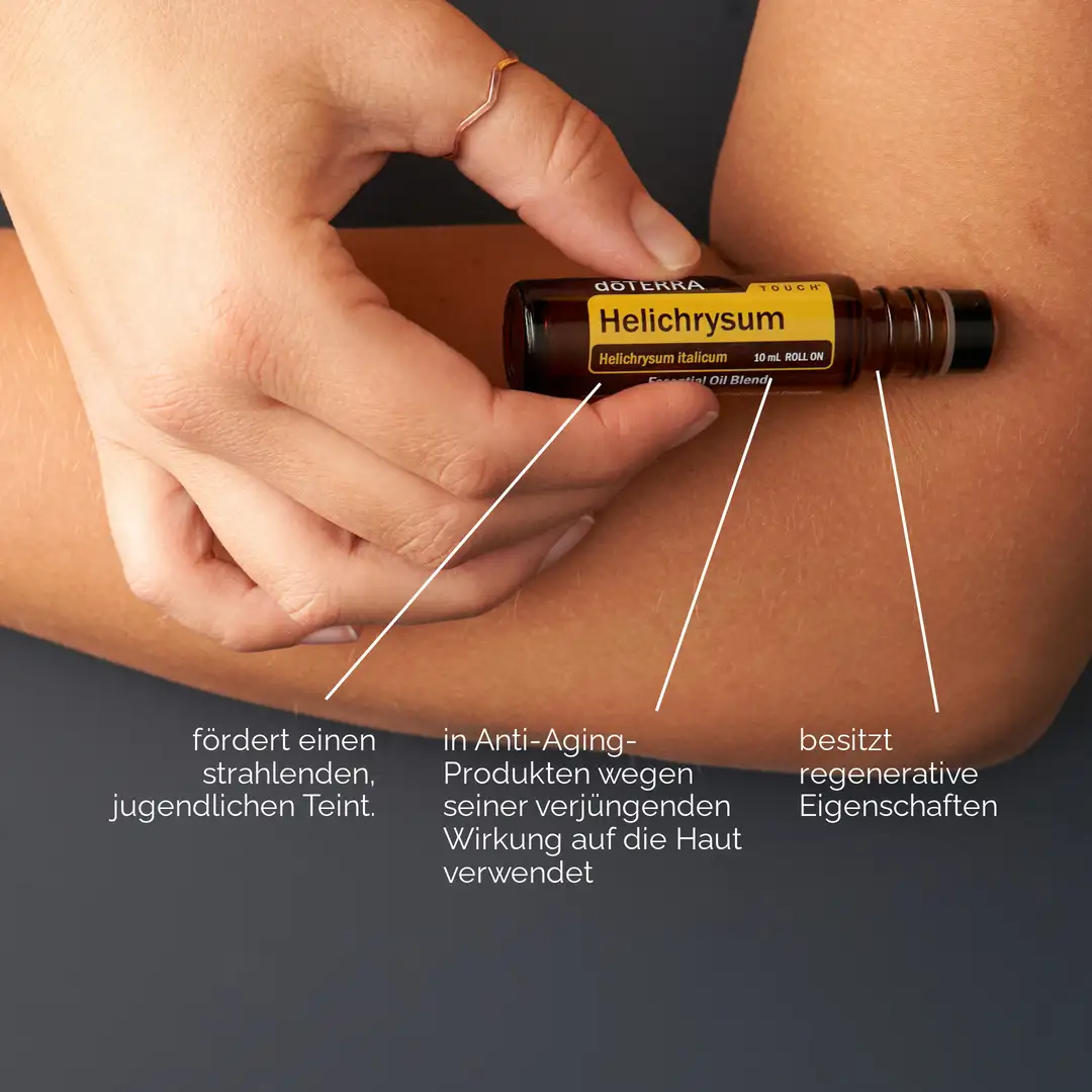 Das honigsüß duftende Helichrysum-Öl erneuert und stellt Ihre Haut wieder her. Helichrysum (Strohblume) wird auch als die ewige oder unvergängliche Blume bezeichnet und häufig in kosmetischen Produkten verwendet, um der Haut ein verjüngtes Aussehen zu verleihen. Strohblume wird schon seit der griechischen Antike in der Pflanzenheilkunde eingesetzt. Strohblumenöl ist speziell wegen seiner vielen Vorteile hoch geschätzt und begehrt. Durch die Kombination mit fraktioniertem Kokosöl kann die doTERRA Helichrysum Touch Ölmischung direkt auf der Haut angwendet werden und noch besser dabei unterstützen, das Auftreten von Hautunreinheiten zu reduzieren und einen strahlenden Teint fördern.