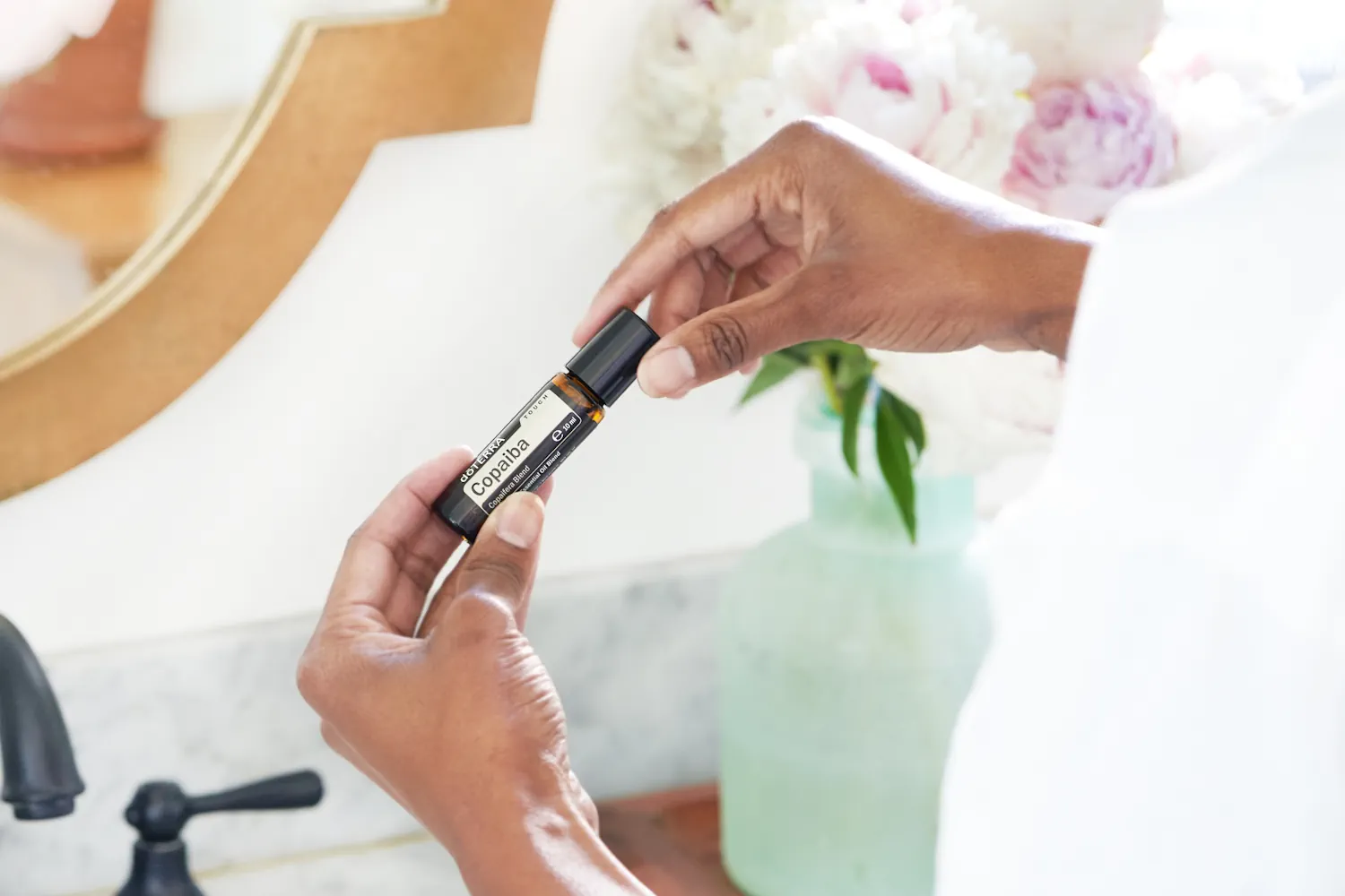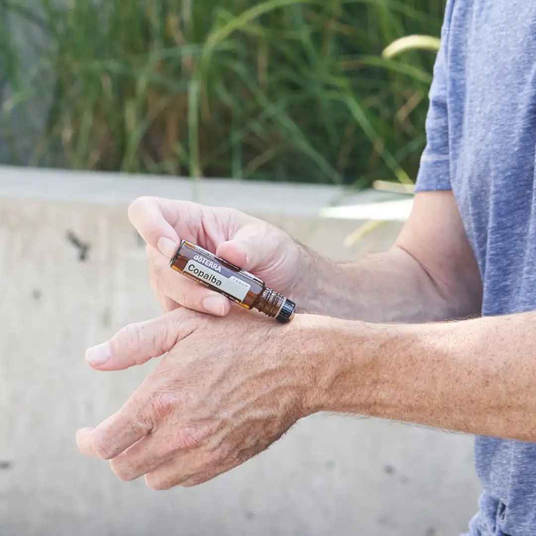 - Um die Haut mit Feuchtigkeit zu versorgen, Copaiba-Touch auf trockene und beanspruchte Hautstellen auftragen.