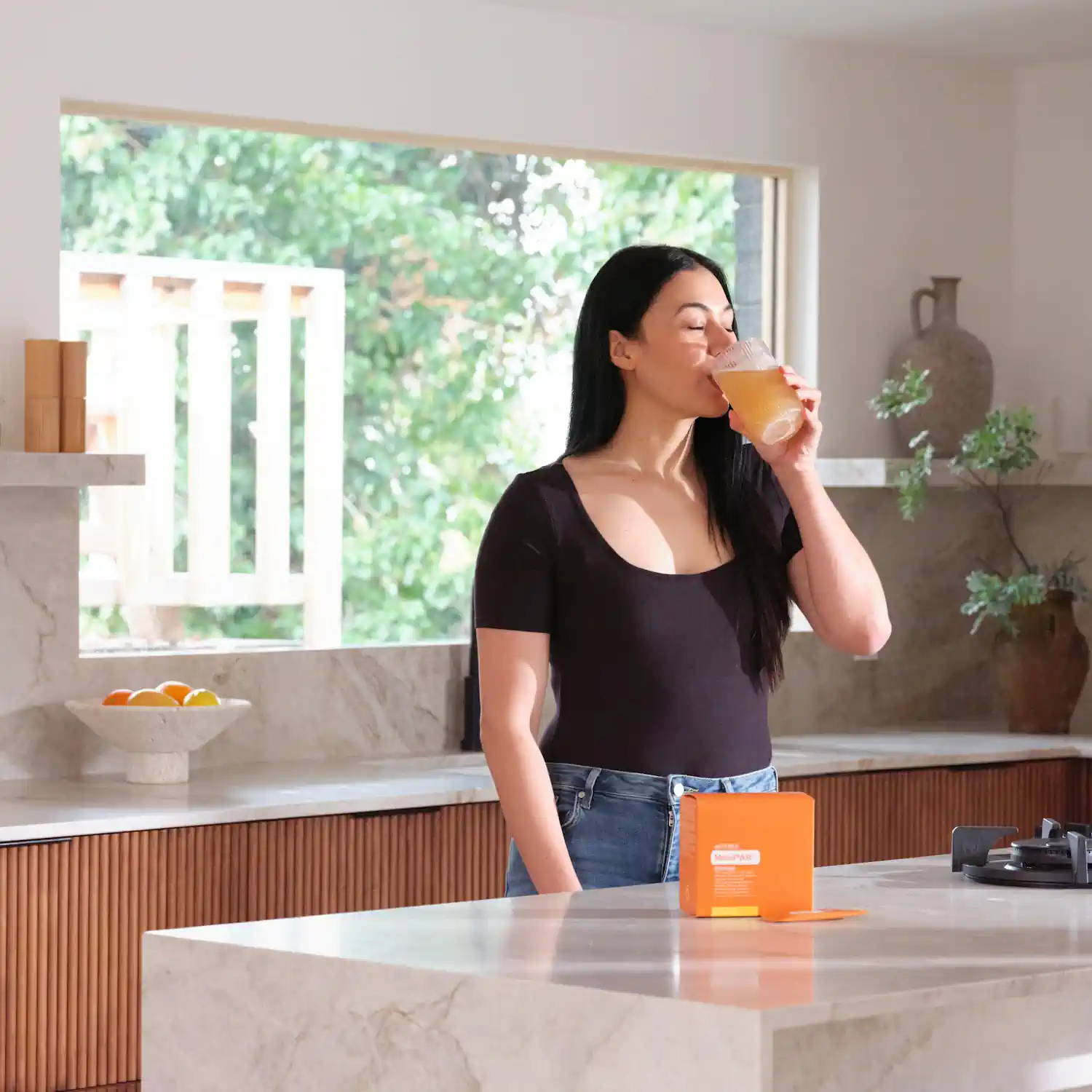 - Inhaltsstoffe: Fischkollagen, Emulgator (Akaziengummi), Säureregulator (Zitronensäure), Bierhefe (Saccharomyces cerevisiae), Calciumcarbonat, Geschmacksverstärker (Natriumgluconat), L-Ascorbinsäure, Sanddornfruchtextrakt (Hippophae rhamnoides), natürliches Aroma, Süßstoff (Steviolglykoside aus Stevia), rotes Traubensaftkonzentrat, Traubenkernextrakt (Vitis vinifera), Stabilisatoren (Phospholipide, Fettsäuren), Extrakt aus roten Orangen (Citrus sinensis), Natriumhyaluronat, Extrakt aus Rosenapfel (Malus pumila), pflanzliche Fette, ätherisches Öl aus der Schale der Grapefruit (Citrus paradisi), Extrakt aus Reiskleie/-keim (Oryza sativa), ätherisches Öl aus der Schale der Zitrone (Citrus limon), Farbstoff (Chlorophyllin), Nicotinamid-Adenin-Dinucleotid, Bioflavonoide aus Citrus, ätherisches Öl aus Pfefferminz (Mentha piperita), ätherisches Öl aus Ingwer (Zingiber officinale), Farbstoff (Beta-Carotin), ätherisches Öl aus Zimtrinde (Cinnamomum zeylanicum), D-Biotin.